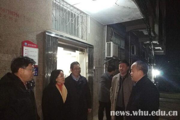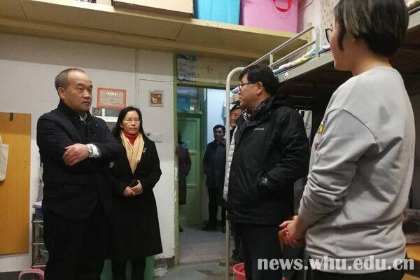 窦贤康一行先后来到枫园3舍、湖滨6舍和工学部8舍,实地查看了宿舍内部及公共卫生间、淋浴间设施情况,向宿舍管理员详细询问了学生宿舍管理及近期气温骤降后宿舍供水、供电、取暖现状。